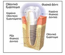Αποτελούν την πιο σύγχρονη λύση για την αντικατάσταση των δοντιών που λείπουν. Πρόκειται για κατασκευές από τιτάνιο ως επί το πλείστον που τοποθετούνται, εν είδει βίδας, μέσα στο κόκαλο των γνάθων και έχουν το σχήμα της ρίζας του δοντιού. Εμφύτευμα, δηλαδή, ονομάζουμε τη «ρίζα» που φτιάξαμε, στην οποία στηρίζεται το υπόλοιπο δόντι, που είναι συνήθως από πορσελάνη.